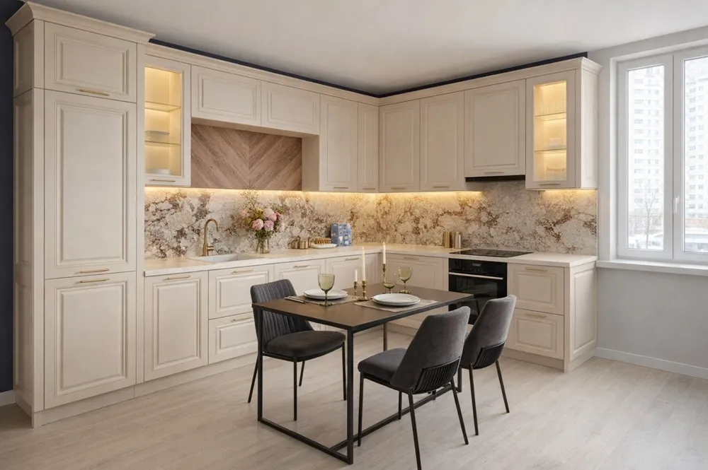 расположение техники и практичную систему хранения, обеспечивающую быстрый доступ к посуде, удобство при приготовлении и порядок в кухонном пространстве благодаря продуманным модулям, выдвижным элементам и логичной компоновке. Сбалансированная эргономика и гибкие модульные решения адаптируют гарнитур под потребности семьи.