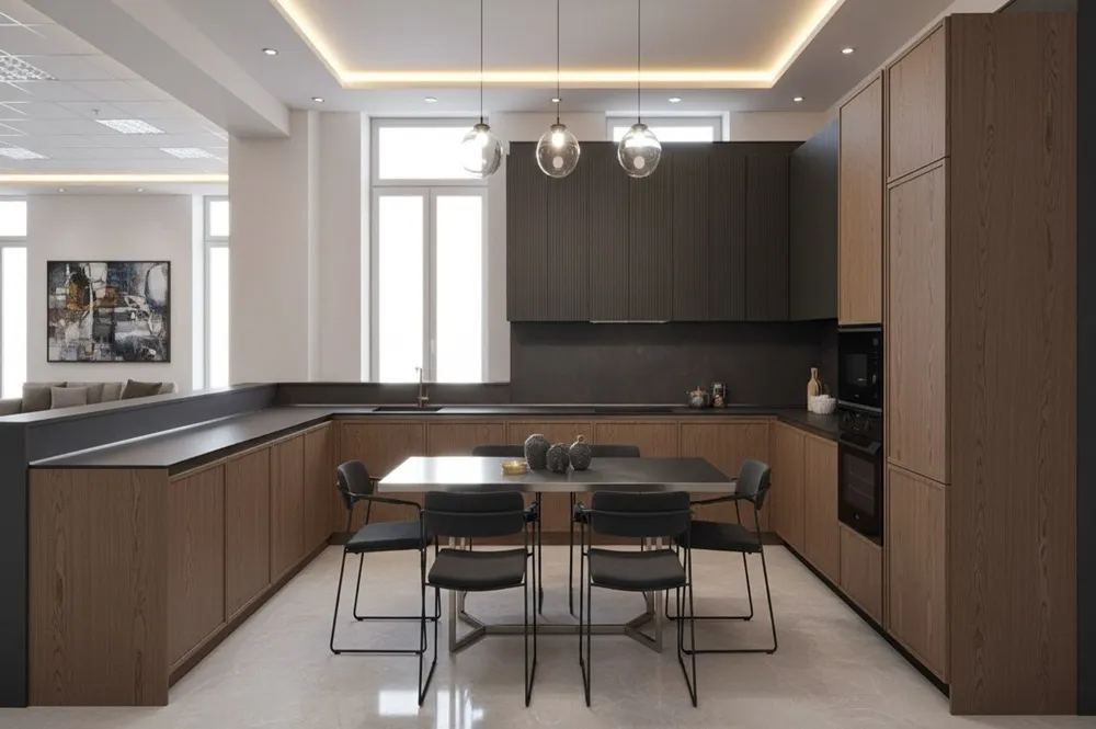разместить технику, шкафы и столешницы так, чтобы процесс готовки был лёгким и приятным. Вместительность сочетается с продуманной эргономикой.