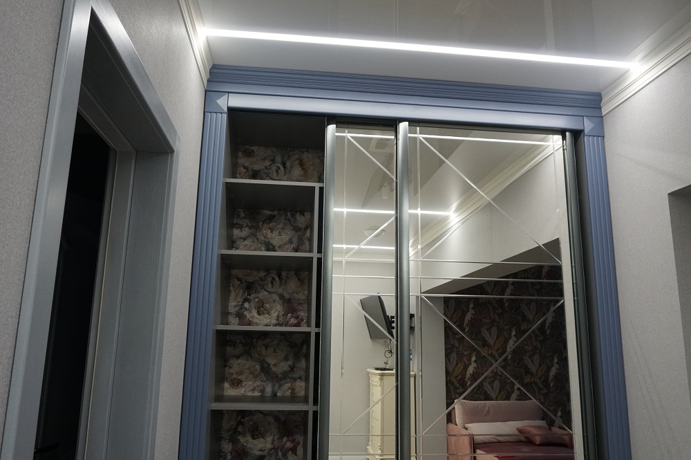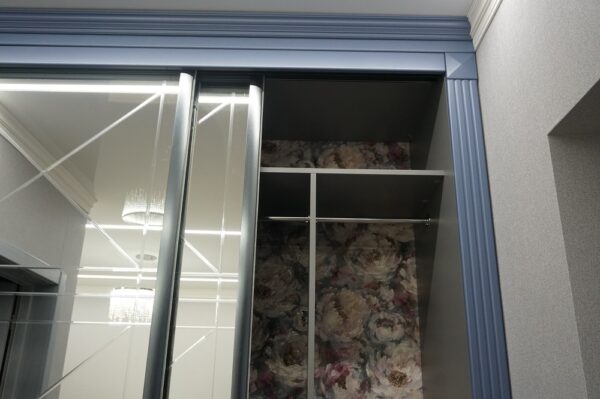 С зеркальным фасадом, сочетающим классическую поверхность и матовые вставки, будет эффектно смотреться и в просторных, и в небольших помещениях. Полностью занимающая стену двухдверная конструкция визуально расширяет пространство, позволяет скрыть недостатки планировки и выгодно использовать особенности. За простыми и надежными в эксплуатации раздвижными дверцами располагается просторное внутреннее отделение для предметов гардероба и домашнего текстиля.