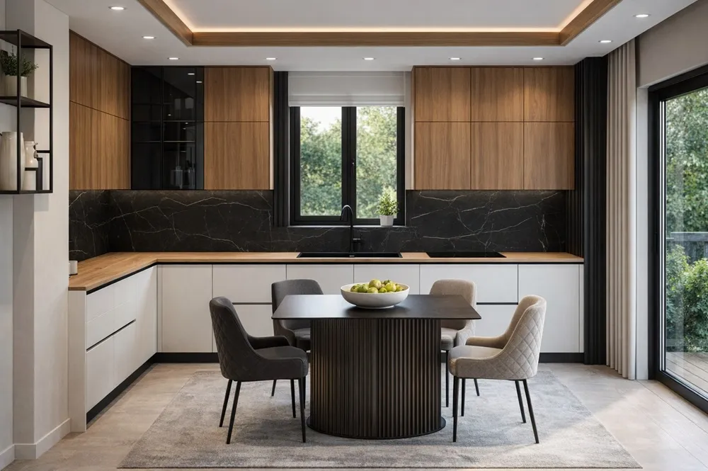 оставляет центр помещения свободным, обеспечивая свободное передвижение. Вместительные шкафы и продуманная организация хранения помогут разместить всю необходимую утварь, не загромождая пространство.