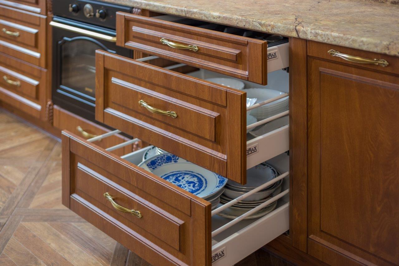 Фасад имеет строгие линии, но, в то же время, создает легкую атмосферу. Обязательный элемент для классического оформления — стеклянные вставки и слегка выступающий карниз. Неброские элементы декора в сочетании с элегантными ручками придают гарнитуру изысканный шарм. Кухня оснащена функциональными конструкциями, имеет вместительную и удобную систему хранения.