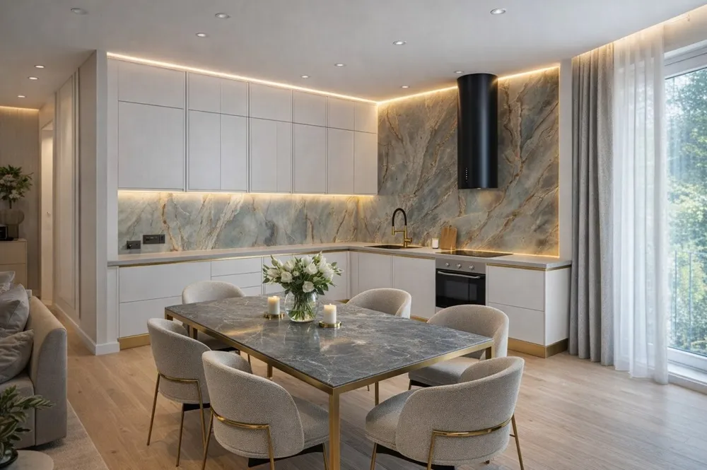 несколько функциональных участков, модули хранения распределены по логике использования, а выдвижные системы и органайзеры помогают поддерживать порядок, ускорять приготовление и создавать комфортное пространство для бытовых задач и совместной готовки с возможностью перестановки модулей и добавления аксессуаров удобно.
